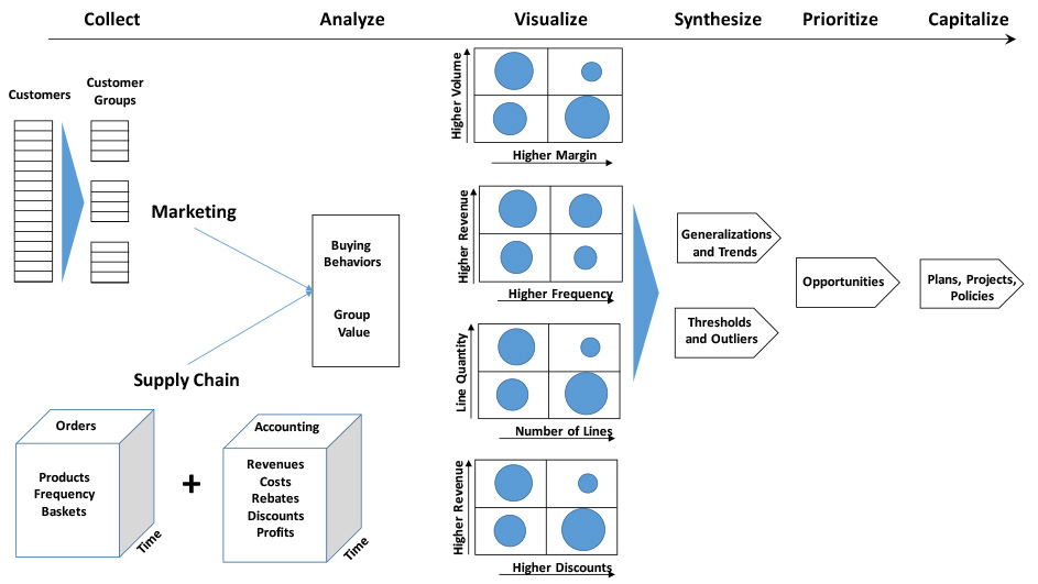 Developing these insights requires multiple steps. First, there is a need to group customers according to a logical set of criteria to facilitate the identification of group behaviors. This can be difficult as it often requires the development of subjective and relative definitions. For example, what is a large customer? What is a large order? What is a long lead time? A large customer in one company may be a small one in another – likewise for orders and lead times.