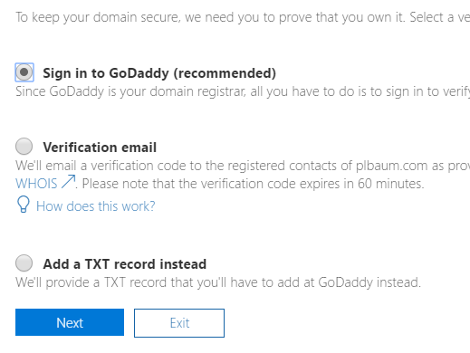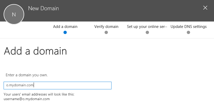 This is the same process as before. MyDomain.com must be verified before adding the subdomain. The subdomain will automatically verify, or you can add a DNS TXT record at your domain registrar.