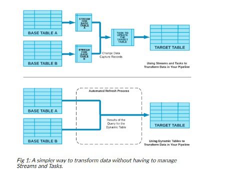 The bottom line: In the past, to process delta changes, data engineers had to use streams to capture change data and tasks to automate the job. With the introduction of dynamic tables, all incremental changes are handled in an automated way, eliminating the need for streams and tasks altogether.