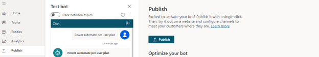 When I’m satisfied with my chatbot, all I need to do is click Publish to deploy all the changes I’ve made to the chatbot and prepare it for accessibility (either internally with authentication or publicly available anonymously).
