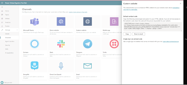 Finally, I can grab my code snippets based on the channel I want my chatbot to serve. In the example below, I want to deploy it to a publicly available website. I can copy and paste my embed code into the web pages I am serving up.