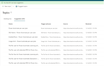 By clicking Suggested, you can see all of the possible topics. In my case, the chatbot found 391 new topics to choose from. Each topic is a possible question and answer pair users can leverage when conversing with the chatbot. On the Suggested tab, I can review all of the pairs pertinent to what I want the chatbot to convey.