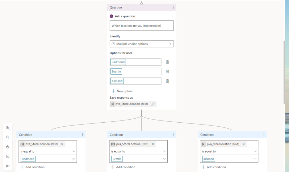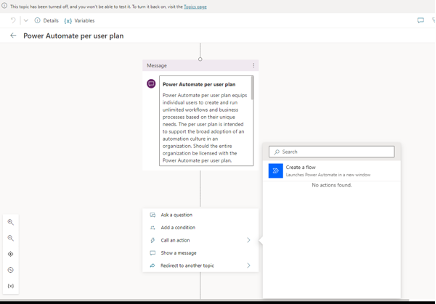 Within the Authoring Canvas, I can then modify the message that the chatbot will return when they ask that particular question. I can also add in Conditions (and Actions) to be performed during this topic. For instance, if I wanted to send the user an email about this topic, I can attach a Power Automate flow to send that email or do any other function developed in a Flow.