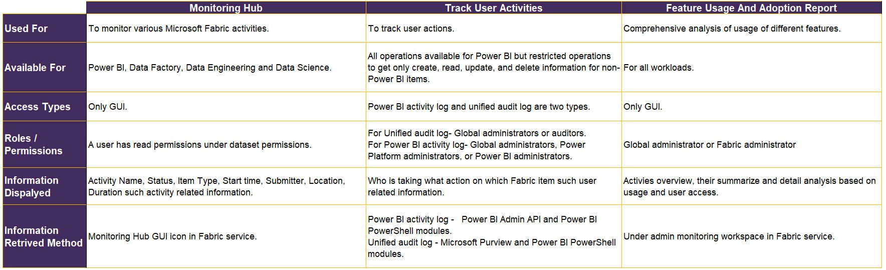 Below is the bird’s eye information matrix for all three monitoring methods in Fabric.
