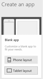For this App, I am going to create a ‘Blank App’ with the ‘Tablet Layout’. Provides a little more real estate to help demonstrate functionality, also I use a Surface so it’s easier to see and interact with when using Touch: