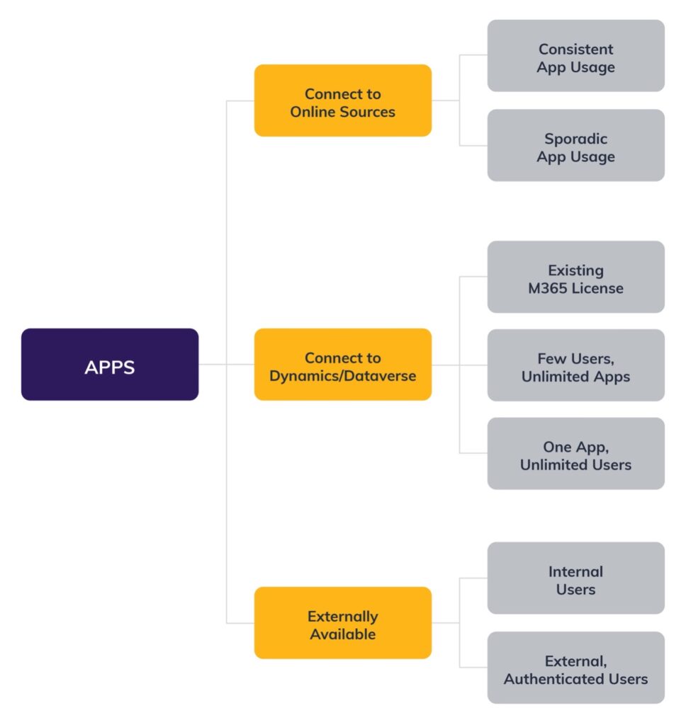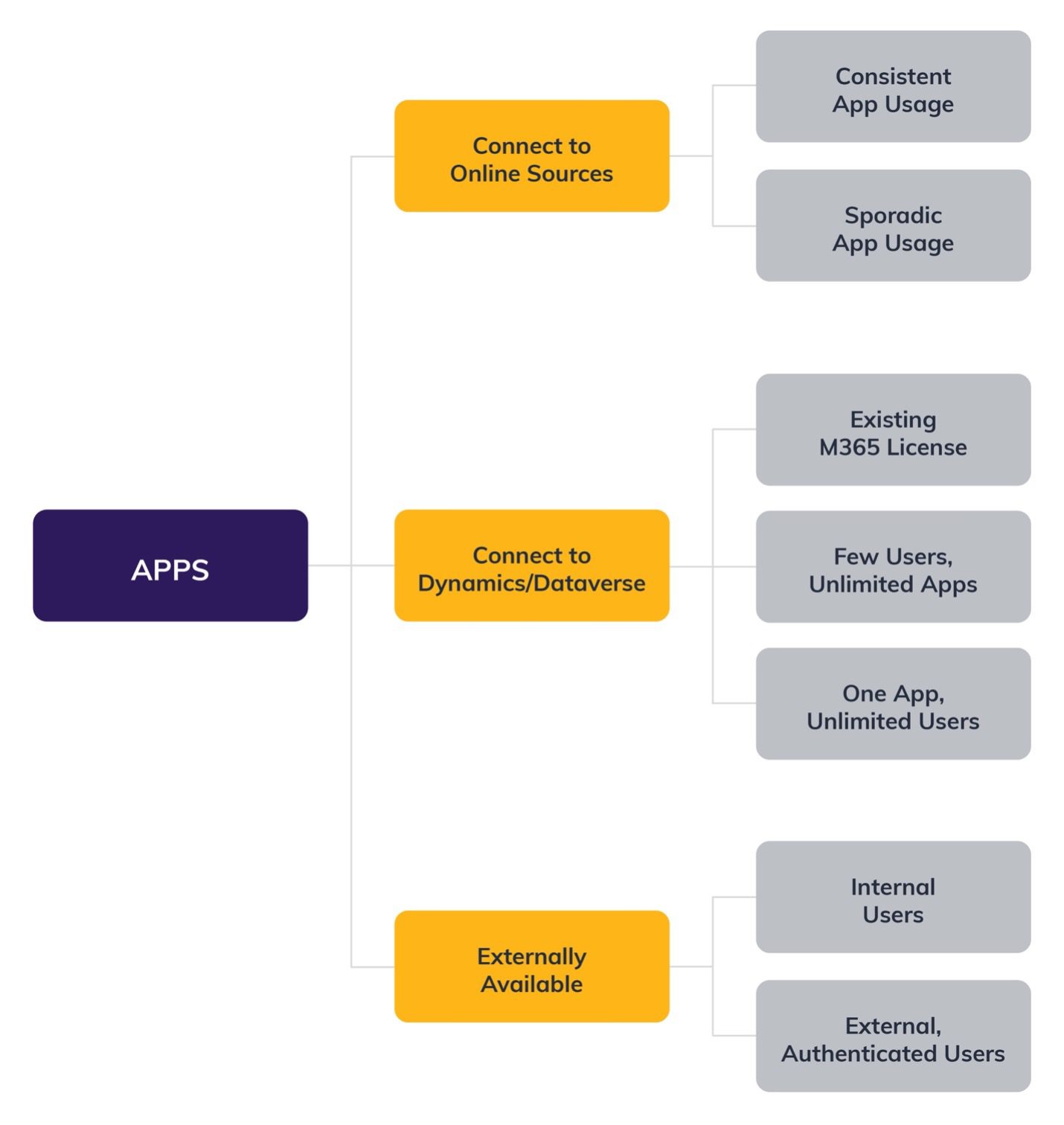 To visualize these series of questions and many more, we have created a flowchart. After you make your way through your flow-chart and determine the what and who of your Power Platform licensing needs, you can determine with confidence which of the five programs you would like access to, which add-ons you need, and to what extent you would like these programs to interact with other Microsoft programs you may already have, like 365 or Azure.