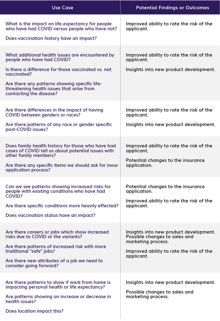 This analysis can help underwriters save time and effort, as they won’t have to manually review every application. Adoption of ML and AI models can help quicken the pace of the process and allow underwriters, actuaries, and data scientists the ability to bring in additional COVID-related information.