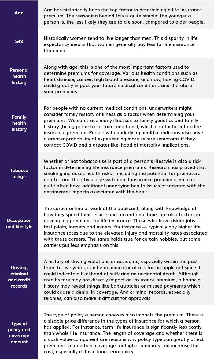 The pandemic has had a significant impact on life insurance underwriting. Many insurance companies have temporarily changed their underwriting guidelines to accommodate the unique challenges and risks the pandemic presented. Traditionally, there are many factors underwriters use to determine policy and pricing. The following are examples of the most common ones: